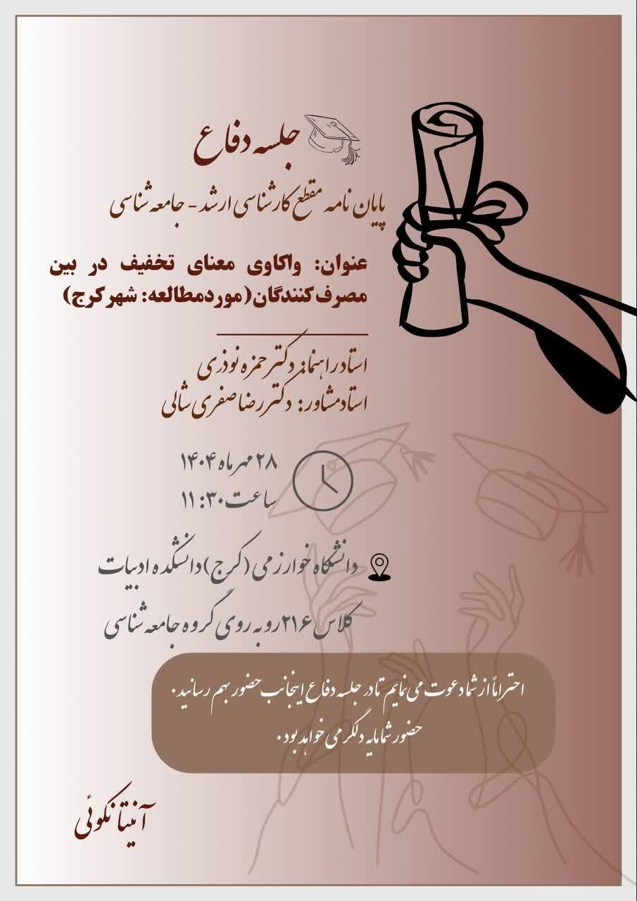جلسه دفاع از پایان نامه کارشناسی ارشد رشته جامعه شناسی عنوان: واکاوی معنای تخفیف در بین مصرف کنندگان(مورد مطالعه:شهر کرج)؛ زمان: دوشنبه ۲۸ مهرماه